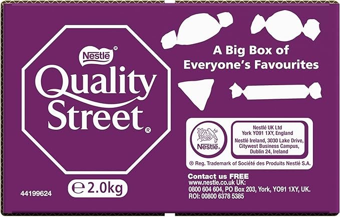 • Quality Street bulk box includes 2 kg of individually wrapped chocolates; the most QUALITY STREET you’ll find anywhere! Contains no artificial colours, flavours or preservative. Box may arrive in alternative packaging